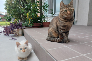 | 令和7年10月3日 金曜日 誰かネコちゃん、もらってくれませんかぁ? お隣さんと往復してる親子のネコちゃんです。 母親はレンガ色の混じったキジトラ。子猫は全体に白く尻尾と耳に茶色が入ります。 可愛いけど・・・ウチは”まっき”で手一杯ですからね。 |