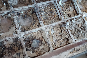 | フスマの残骸にはイタチの巣の名残が 動物の骨・魚の頭・カモのクチバシ等々 |