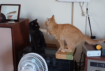 | 令和7年12月26日 金曜日 風の冷たさが体にこたえる。 こんな日は暖かくした部屋にこもっているのが一番。 階下の倉庫を棲み処としている子ネコちゃん。 毎度毎度、部屋のドアを外からごそごそするものだから・・・ たまらずドアを少し開けてしまった。 するりと入り込んだネコちゃん2匹、初めて入った部屋に興味津々。 散らかした部屋の中には不安定なモノがいっぱい。 2匹が動き始めるとモノを落とさないかヒヤヒヤ。 でも、そこはネコです。案外大丈夫なんですね。 そんな様子を眺めていましたが・・・最後には棚のCDをばっさり落とされました。 やっぱり子ネコなんだな。 |