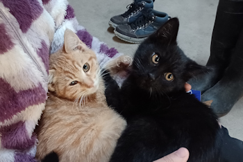 | 令和8年1月6日 火曜日 誰かもらってくれませんかねぇ・・・ウチの納屋で保護しているネコちゃん。 チャー・クマともに雄。いたって活発です。 チャーは保護当初から人見知りしないお兄ちゃんタイプ。 一方のクマは距離を置くタイプでいつも逃げ回っていましたが、やっと触れるようになりました。 今は2匹でじゃれあっていますが、時々本気度が増すことがあります。 じっとしている時はいつも2匹で団子になってるのにね。 |