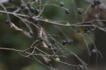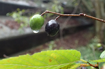 | 観察路にて ムクの実も熟れ始めた どこもかしこも本降りの雨でジットリでした |