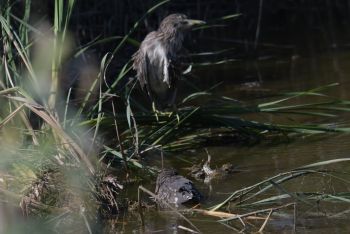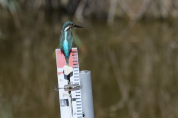 水位標柱にとまったカワセミ | あまりの暑さにゴイサギ(手前)も水から 上がってきません 東観察舎より |