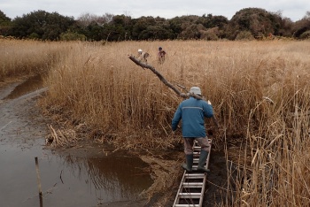 | 幼木切りが終わったら止まり木を搬入 水路は干上がっているが渡るのは困難 |