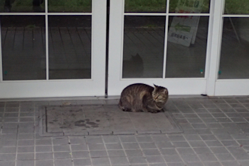ネコマタは学習者玄関で雨宿り |