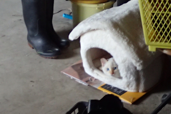 | シロチャはついに納屋のホワイトハウスに入室 ”まっき”が子猫の時は決して入らなかったのにね |