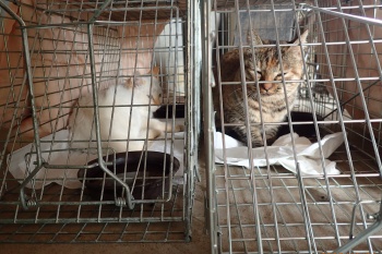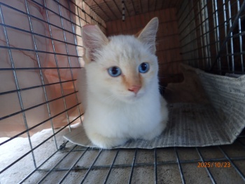 | 令和7年10月21日 火曜日 ムギチャとシロチャの親子を避妊去勢手術に連れていくことにしました。 四日前から捕獲機に慣れさせて今朝、2匹を捕獲することができました。 痛い目に会わせるのは不本意だけど、地域猫として暮らすためには仕方ないです。 今まで餌を求めて毎朝ニャーニャーとうるさかったが、ゲージに入れてからはほとんど鳴かない。 一時、ムギチャが唸り声を上げたので様子を見ると白猫が来てた。特徴からシロチャの父親のような気がする。やっぱり手術に連れていく時期だったようです。 |