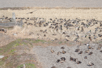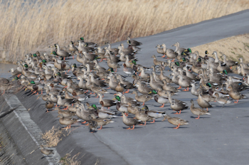 | カルガモ、マガモが多く、ヒドリガモが続く | 土手から田んぼへ降りていくカモたち |