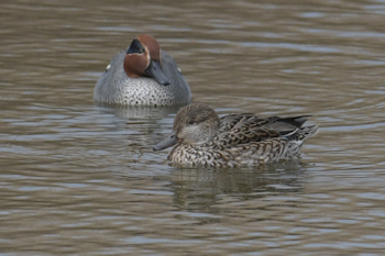 | 東観察舎より撮影 シマアジ♂はコガモ♀につきっきり |