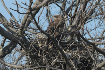 西観察舎より撮影 抱卵中のトビ♀ ビニール類で巣を整えて?いた |