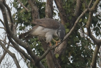 | 中観察舎より撮影 オオタカ成鳥 何かクチバシについてる |