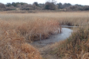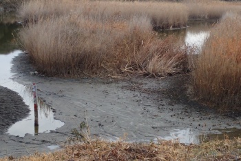| 学習舎前の水位標柱は根元が干上がった | 東観察舎前はクイナの採餌には最適状態 これだけは1月16日撮影 |
